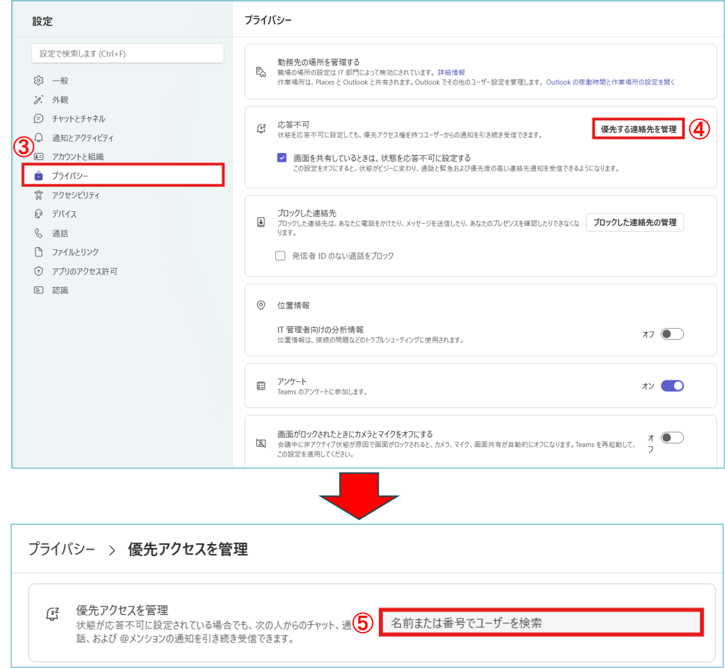 2.設定画面で、③「プライバシー」を選択し、④「優先アクセスを管理」をクリック後、⑤「名前または番号でユーザーを検索」から追加したいユーザー名を入力します。