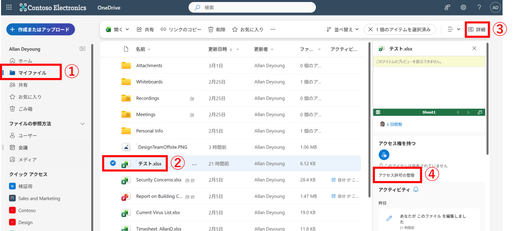 ①「マイファイル」>②「該当のファイル」にチェック>③「詳細」>④「アクセス許可の管理」をクリックします。