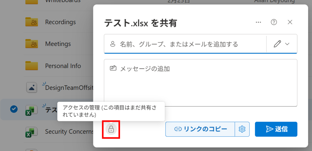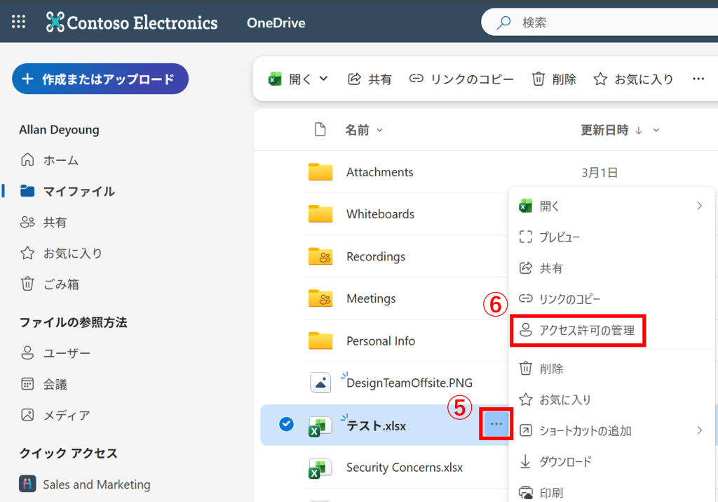 もしくは、⑤「該当ファイル」にカーソルを合わせた後「…」クリック>⑥「アクセス許可の管理」からでも同様に開けます。