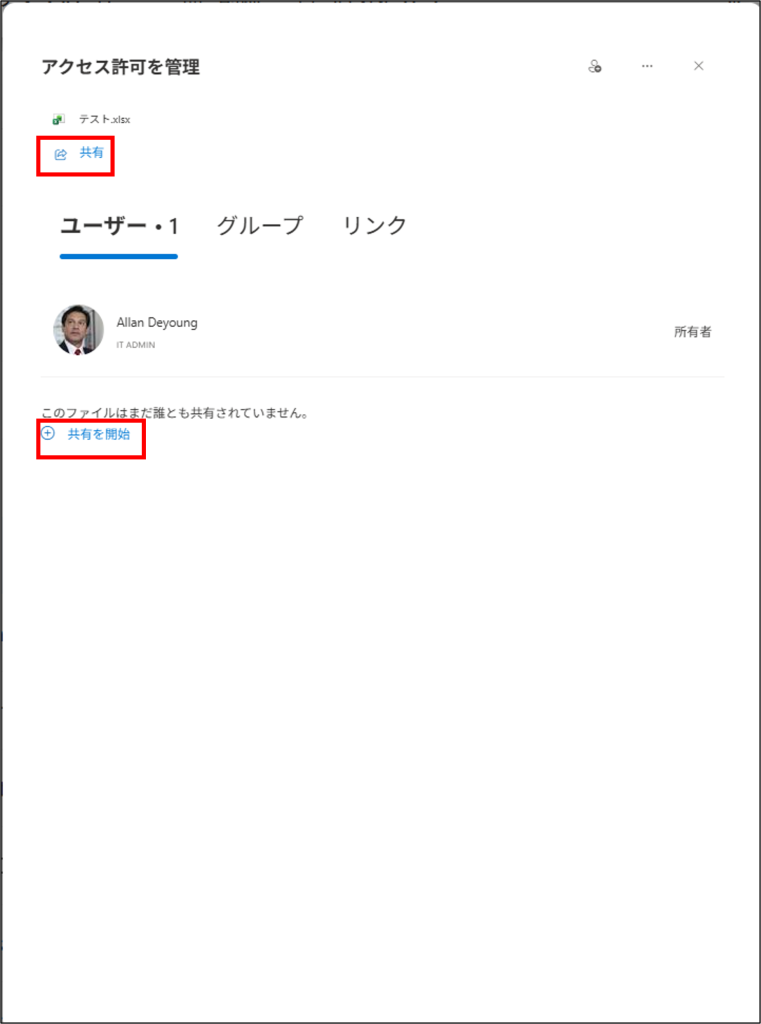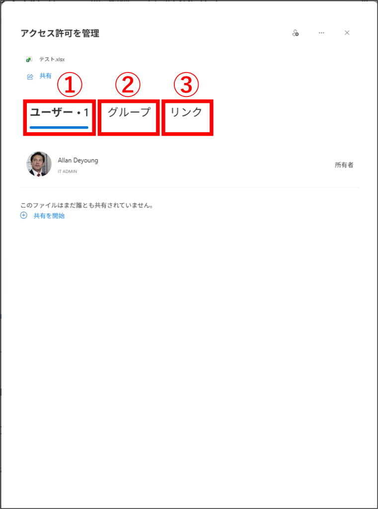 3.①「ユーザー」②「グループ」③「リンク」の各タブから、共有状況の確認ができます。