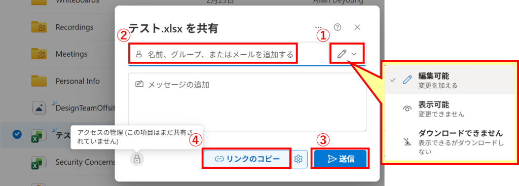 ①プルダウンをクリックのうえ、ファイルの取り扱い方を3パターンから選択>②共有先情報(名前・グループ・メールアドレスのいずれか)を入力>③「送信」をクリックします。