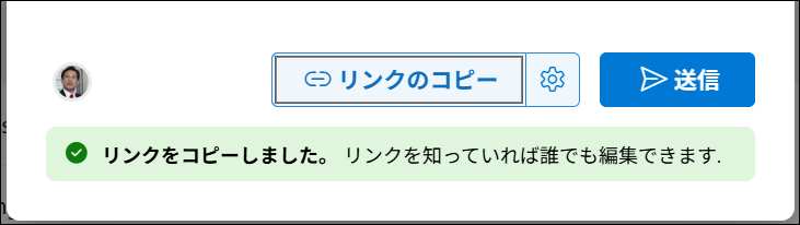 もしくは、②の手順>④「リンクのコピー」をクリックすることで取得できるURL を、メールやチャット等に貼り付けて共有する方法もあります。画像は④の手順実施後の状態です。