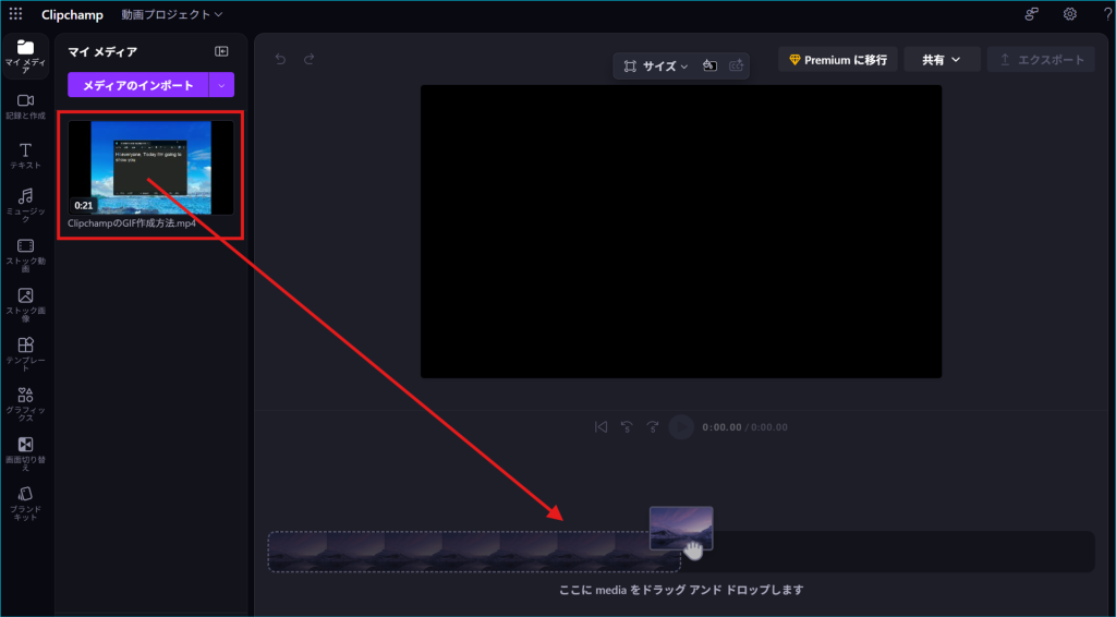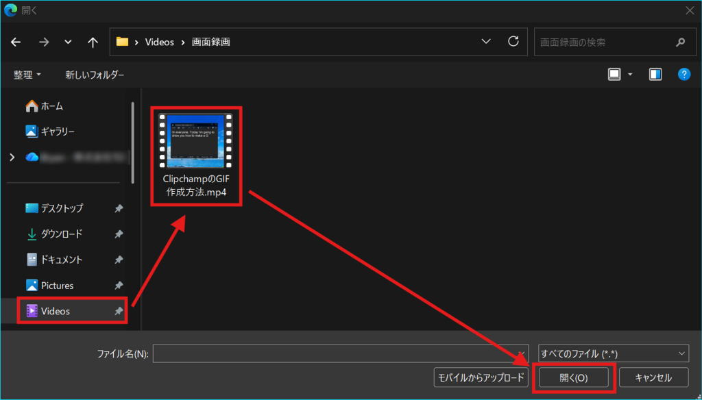 例:「Videos(ビデオ)」>「ClipchampのGIF作成方法.mp4」>「開く」