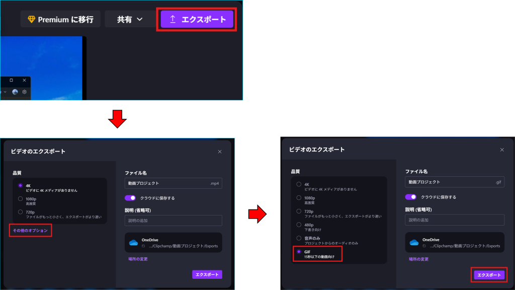ビデオのエクスポート画面で品質から「その他のオプション」>「GIF」の順で選択し、「エクスポート」を押下します。