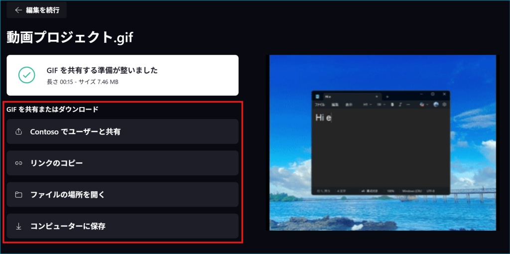 8.エクスポートが完了すると以下の画面が表示され、GIFの共有またはダウンロードが可能になります。