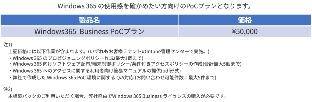 Windows 365 PoCサービス ~ Windows 365 本格導入の前に ~実際の環境で2週間トライアル利用 サービス概要 Windows 365 を本格導入する前に、トライアル利用したいお客様に向けたサービスです。ゼロトラスト Cloud PC PoCサービス では、ゼロトラストセキュリティの考えを取り入れた Windows 365 Business をお試しいただけます。 Windows 365 Cloud PC 導入支援サービスについて 料金・オプション お問い合わせ 導入支援サービスのご紹介